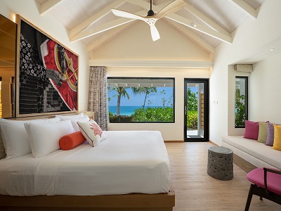 Beach villas are just a few steps from the beach. Dip into the lagoon anytime. Or, soak up the sun in your private outdoor veranda and garden. The interiors are just as inviting with warm, wooden floors, a plush bed, a roomy sofa, elegant motifs, and vibrant textiles. A walk-in wardrobe leads to a spa-like bathroom with a marble vanity and an outdoor shower surrounded by a garden.